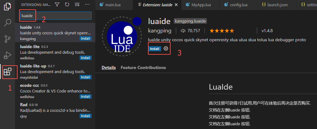 接下来可以使用Visual Studio安装BabeLua插件或者Visual Studio Code安装Luaide插件两种方式调试Lua