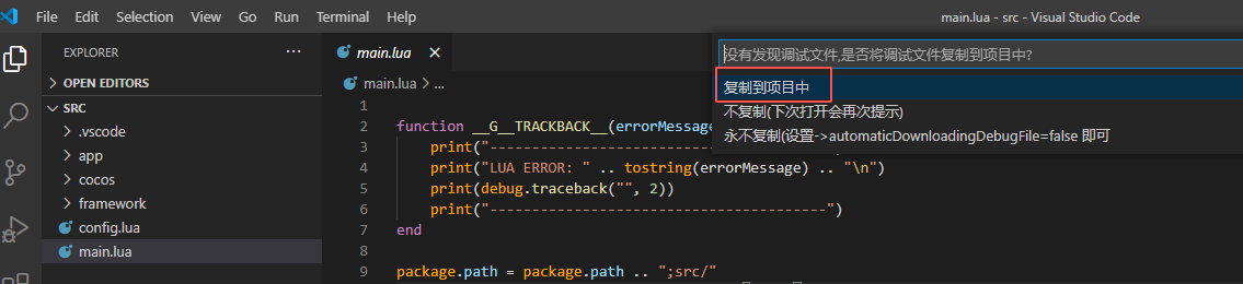 (1)第一种方式是跟着luaide的向导操作,打开VSCode时会检测文件夹内是否有调试文件,如果没有就会弹出向导,选择复制到项目中->选择src文件夹->选择LuaDebugjit文件->选择后缀.lua