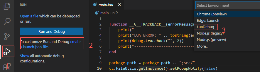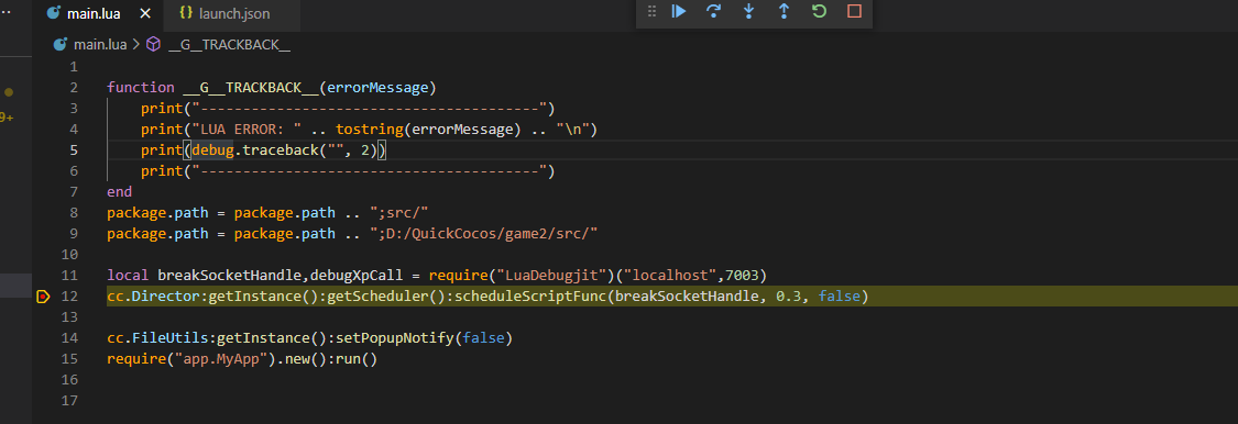 11b.在main.lua中加入调试相关代码, F5启动调试(调试运行需要账号处于登录状态!)