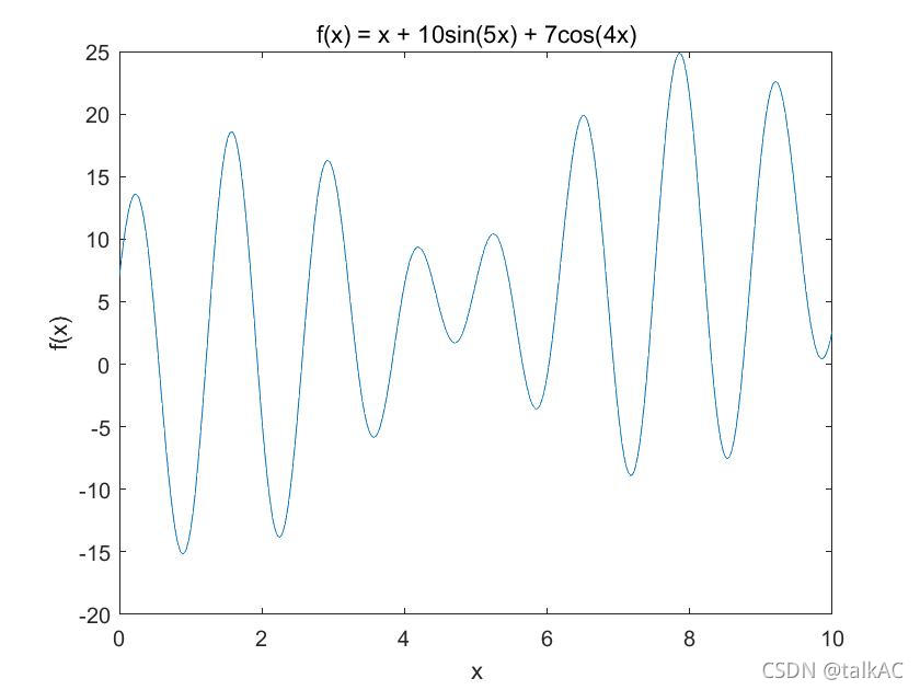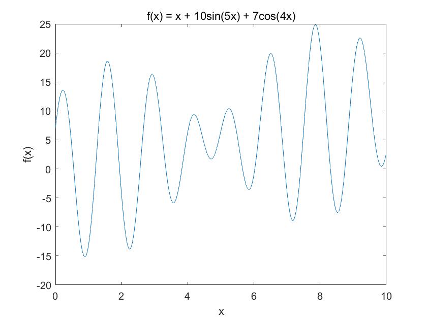 title('f(x) = x + 10sin(5x) + 7cos(4x)');