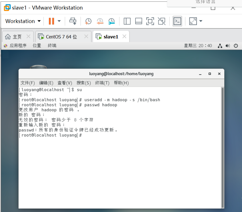 [root@localhost luoyang]# useradd -m hadoop -s /bin/bash [root@localhost luoyang]# passwd hadoop 更改用户 hadoop 的密码 。 新的 密码: 无效的密码: 密码少于 8 个字符 重新输入新的 密码: passwd:所有的身份验证令牌已经成功更新。 [root@localhost luoyang]#