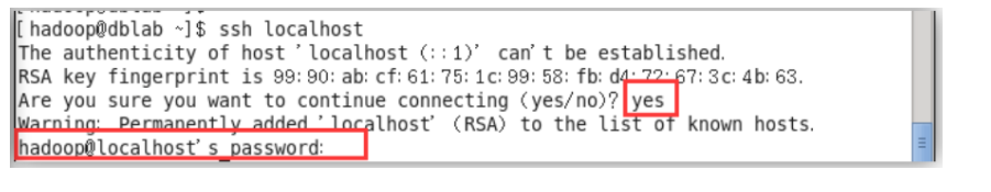 [hadoop@localhost ~]$ cd ~/.ssh/ [hadoop@localhost .ssh]$ ssh-keygen -t rsa [hadoop@localhost .ssh]$ cat id_rsa.pub >> authorized_keys [hadoop@localhost .ssh]$ chmod 600 ./authorized_keys