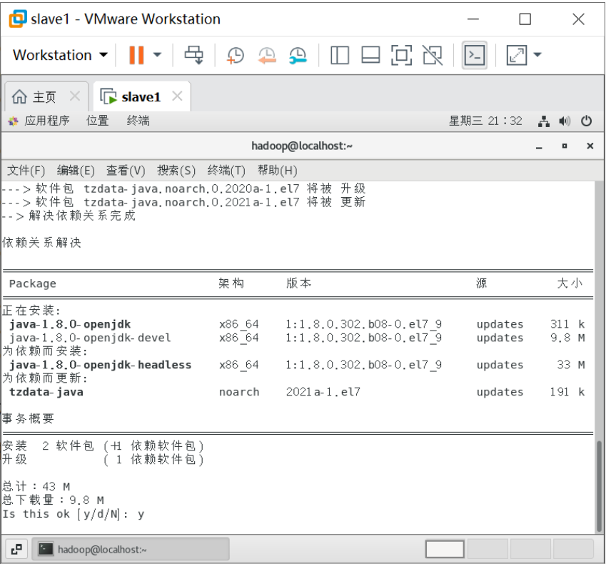 [hadoop@localhost ~]$ sudo yum install java-1.8.0-openjdk java-1.8.0-openjdk-devel