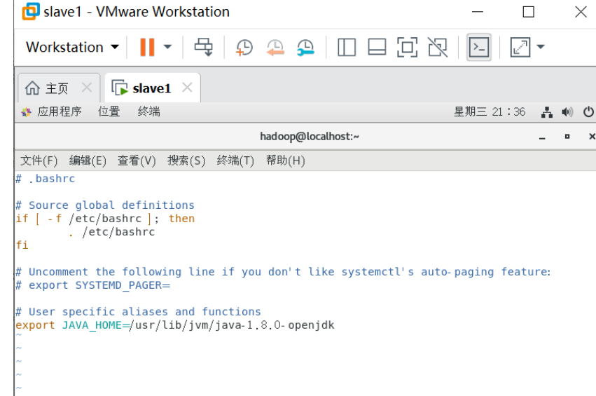 在文件的最后一行加入:export JAVA_HOME=/usr/lib/jvm/java-1.8.0-openjdk