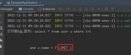 BoundSql boundSql = ms.getSqlSource().getBoundSql(objects[1]); String oldSql = boundSql.getSql().toLowerCase(Locale.CHINA).replace("[\\t\\n\\r]", " "); if (!oldSql.contains("LIMIT")){String newSql = boundSql.getSql().toLowerCase(Locale.CHINA).replace("[\\t\\n\\r]", " ") + " LIMIT 1";BoundSql newBoundSql = new BoundSql(ms.getConfiguration(), newSql,boundSql.getParameterMappings(), boundSql.getParameterObject());MappedStatement newMs = newMappedStatement(ms, new MyBoundSqlSqlSource(newBoundSql));for (ParameterMapping mapping : boundSql.getParameterMappings()) {String prop = mapping.getProperty();if (boundSql.hasAdditionalParameter(prop)) {newBoundSql.setAdditionalParameter(prop, boundSql.getAdditionalParameter(prop));}}Object[] queryArgs = invocation.getArgs();queryArgs[0] = newMs;System.out.println("打印新SQL语句:" + newSql); }