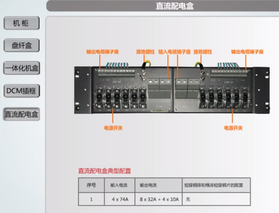 直流配电盒,用于安装在机柜上方,给设备供电。AB两部分,互为备份
