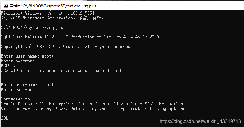 开始——>cmd——>以管理员身份运行——>sqlplus——>输入user-name——>输入password