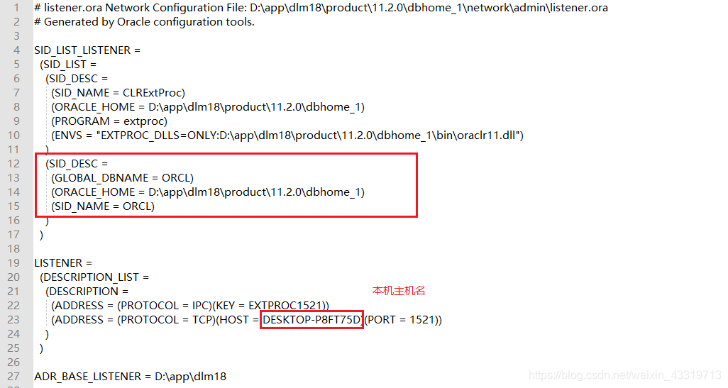 打开本地目录D:\app\dlm18\product\11.2.0\dbhome_1\NETWORK\ADMIN\listener.ora,(根据自身而定)