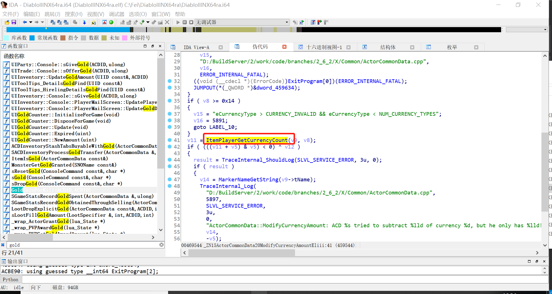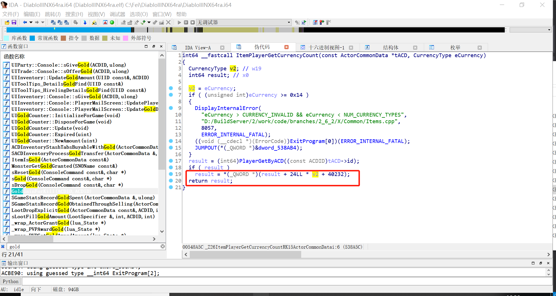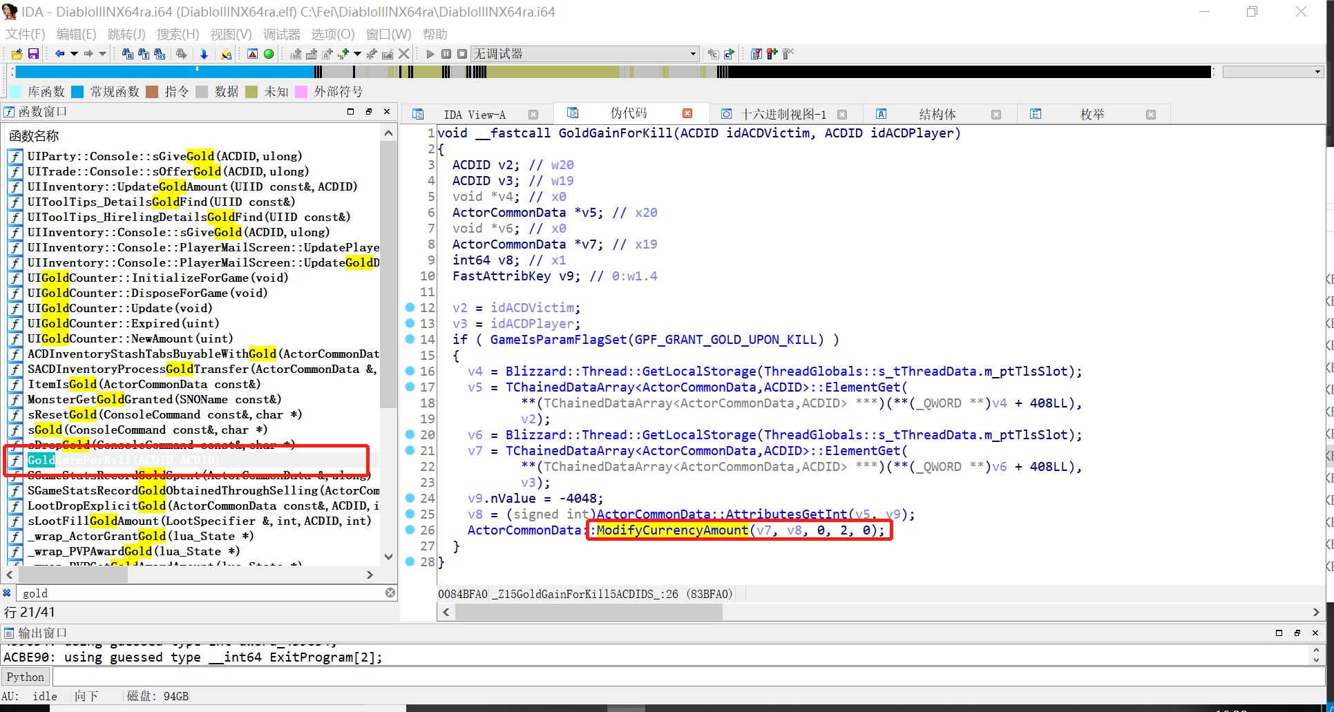 1. 运行神器IDA,然后打开原始版本的DiabloIIINX64ra.elf, 我们首先想要修改的是金币,简单,函数快速筛选里输入gold后,过滤后依然有很多结果,我们找一个简单的函数GoldGainForKill,字面意思就是击杀获取金币,到这个函数伪代码里分析一下发现了ModifyCurrencyAmount,双击点进去