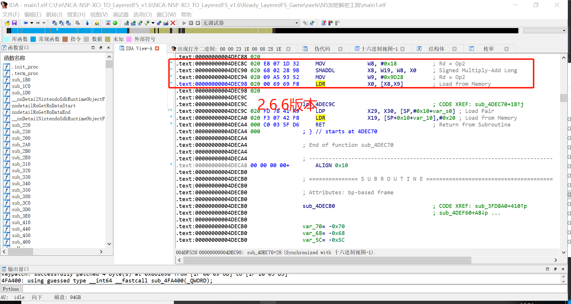 4. 伪代码对应的汇编代码如下图,找到了原始版本的地址,当然我们就可以用上节的搜索方法找到2.6.6版本对应的地址了,然后下一步就在2.6.6 main里修改程序,我们可以看到原始版本和2.6.6版本这段汇编指令是非常类似的,说明版本更新对这一段程序没有什么改动