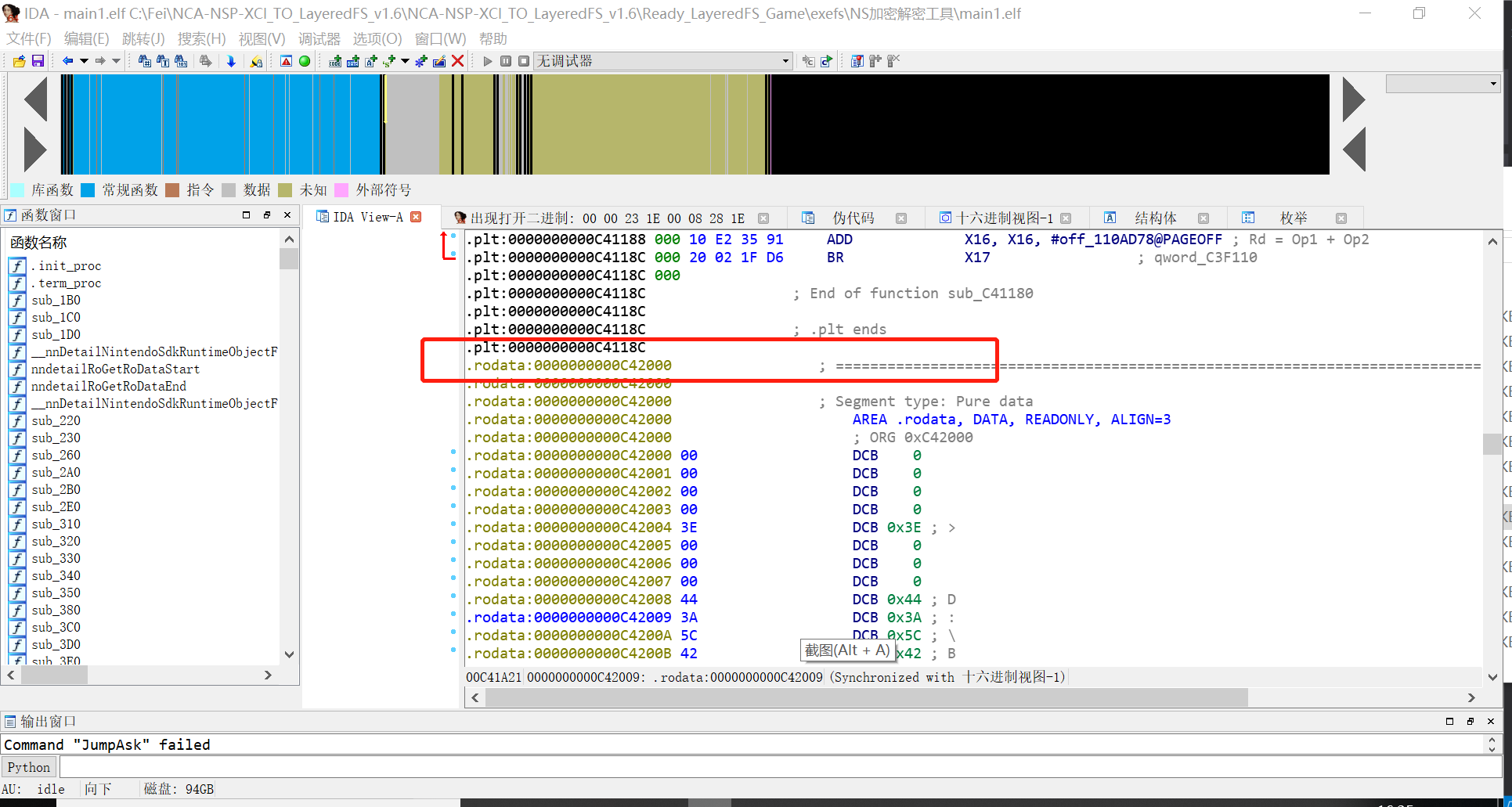 5. 由于接下来要添加一些代码,因此不能直接在源程序上改,我们要找一段空白地址去写自己的代码,用IDA找了一下,发现C4118C到C42000这段区域是不存在的,也就是说我们在内存中修改这段内存是不会影响到游戏程序的,那就在C41300地址开始编写我们自己的代码吧,因为IDA C41300地址不能编辑,我们可以在C42300的地址处开始编写,等制作金手指代码的时候再把地址替换回C41300