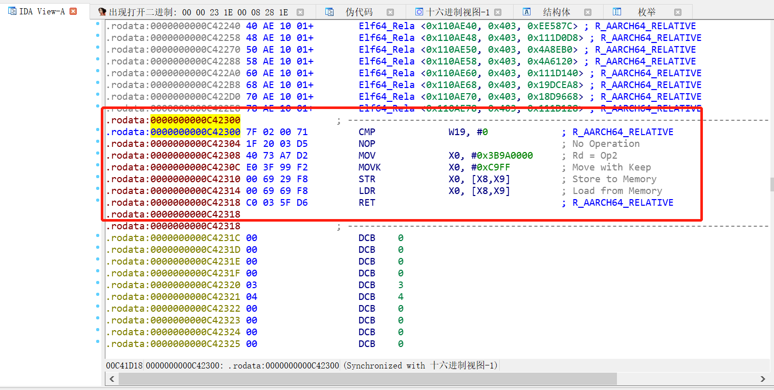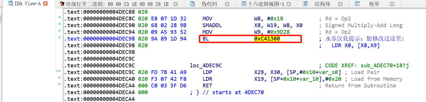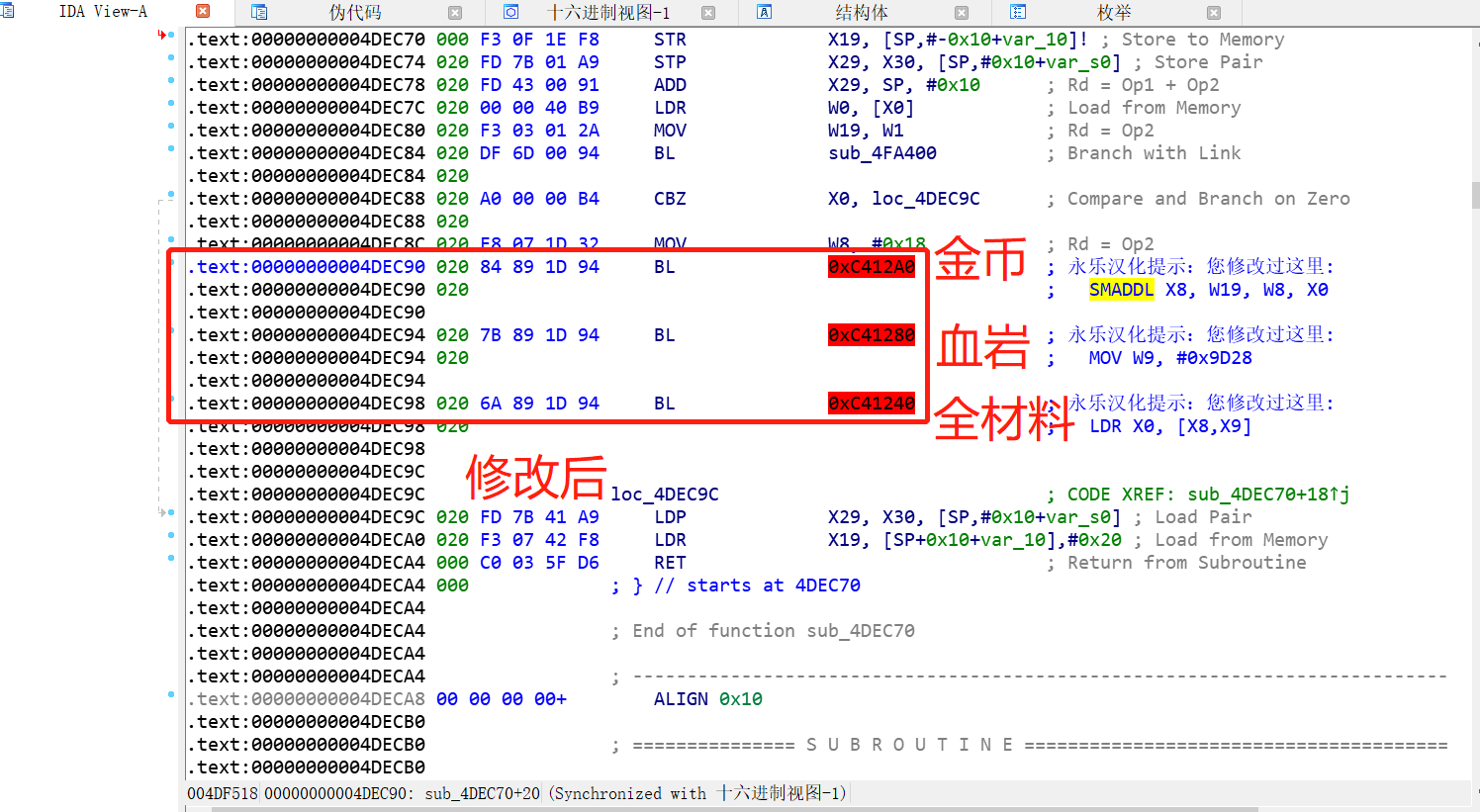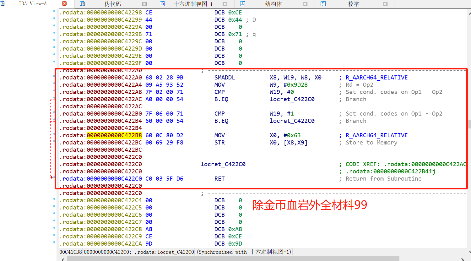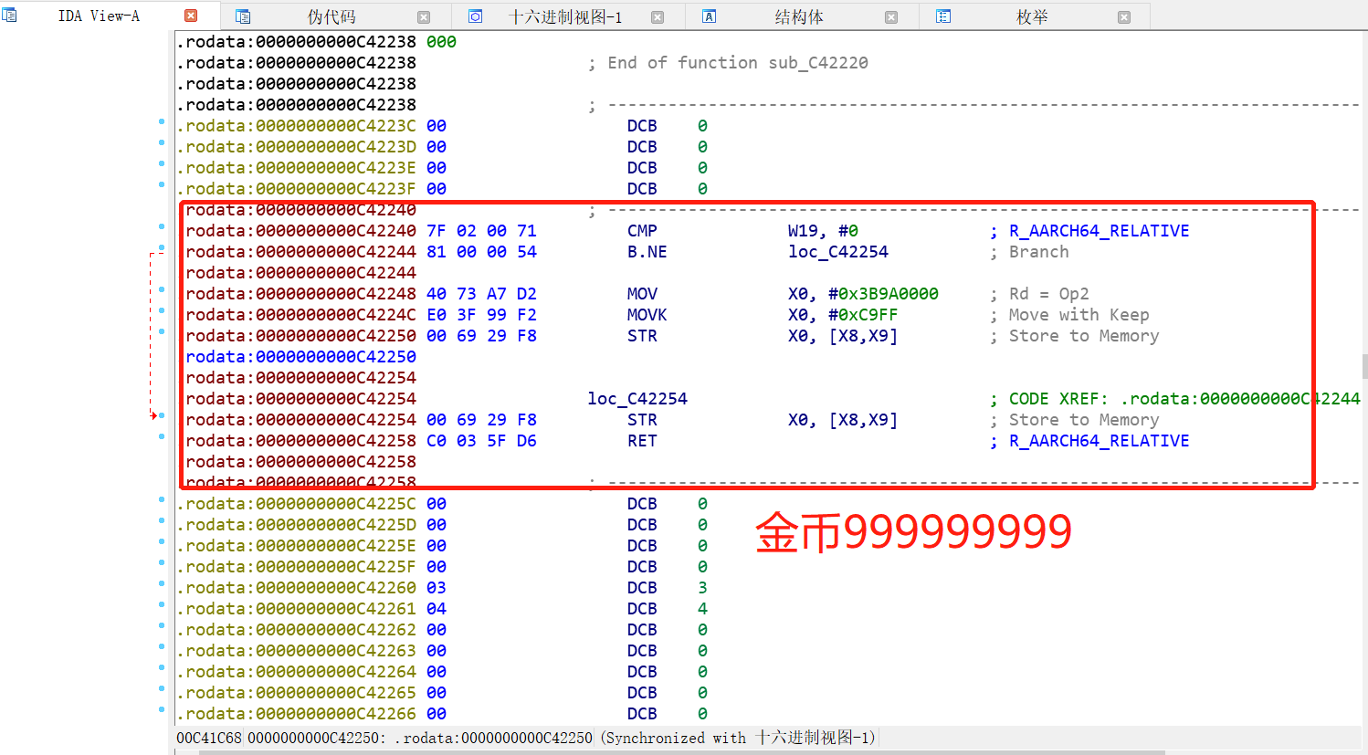 6. 编写的汇编代码如下所示,在这里大概讲一下为什么这么写,w19是货币类型,也就是材料类型,如果是0代表金币,我们留了一个空指令nop,假如读者想要只改金币,可以将nop改为bne, 这样只会在类型是金币时修改数量,999999999的16进制表示是3B9AC9FF,因此我们用mov和movk把要修改的数量给到X0寄存器,STR X0,[X8,X9] 的作用则是吧X0的值发到X8+X9的内存地址,也就是此类材料的内存,LDR X0,[X8,X9]则是程序的原指令,因为我们将原来此指令的地方改成此段代码的函数调用指令BL 0xC41300 ,因此RET返回前必须恢复原指令的调用