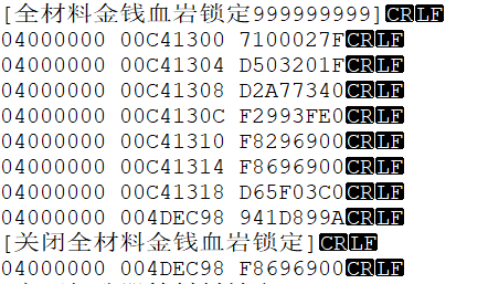 9. 我们也可以根据类似的方法,做出单独锁定金钱,血岩的金手指,另外全材料的数量也可以减少锁定数量,比如锁成99,先编写代码,然后写成金手指格式