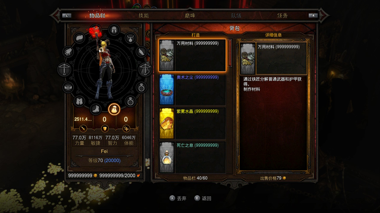 8. 跟以前一样把金手指文件放到机器上,启动游戏,开启金手指,进游戏场景查看人物金币和各个材料,是不是都变成999999999啦。