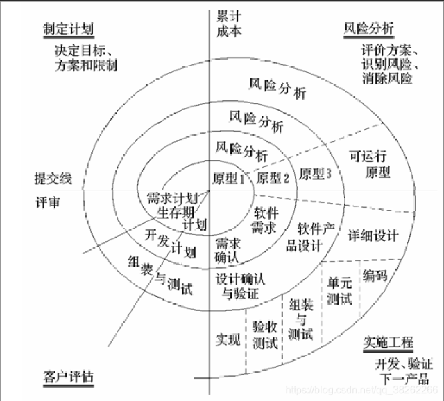 螺旋模型的基本思想:使用原型及其他方法来尽量降低风险。把它看作在每个阶段之前都增加了风险分析过程的快速原型模型。具有风险分析