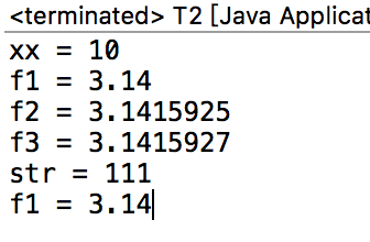 public class T2 {public static void main(String [] args) {// 装箱int x = 10;Integer xx = x;System.out.println("xx = "+xx);// 拆箱Float f1 = new Float(3.14f);Float f2 = new Float(3.1415926d);Float f3 = new Float("3.1415926535897");System.out.println("f1 = "+f1);System.out.println("f2 = "+f2);System.out.println("f3 = "+f3);StringBuffer s = new StringBuffer("111");String str = s.toString();System.out.println("str = "+str);// 封装类也有toString方法,可以将其内容转成字符串System.out.println("f1 = "+f1.toString());}