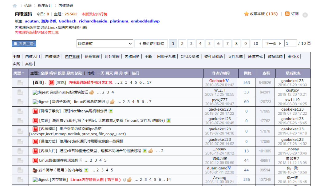 bbs.chinaunix的内核板块,第一代内核程序员聚集地,很多大佬在这里分享内核知识,现在应该都是各大公司技术专家或者负责人了。