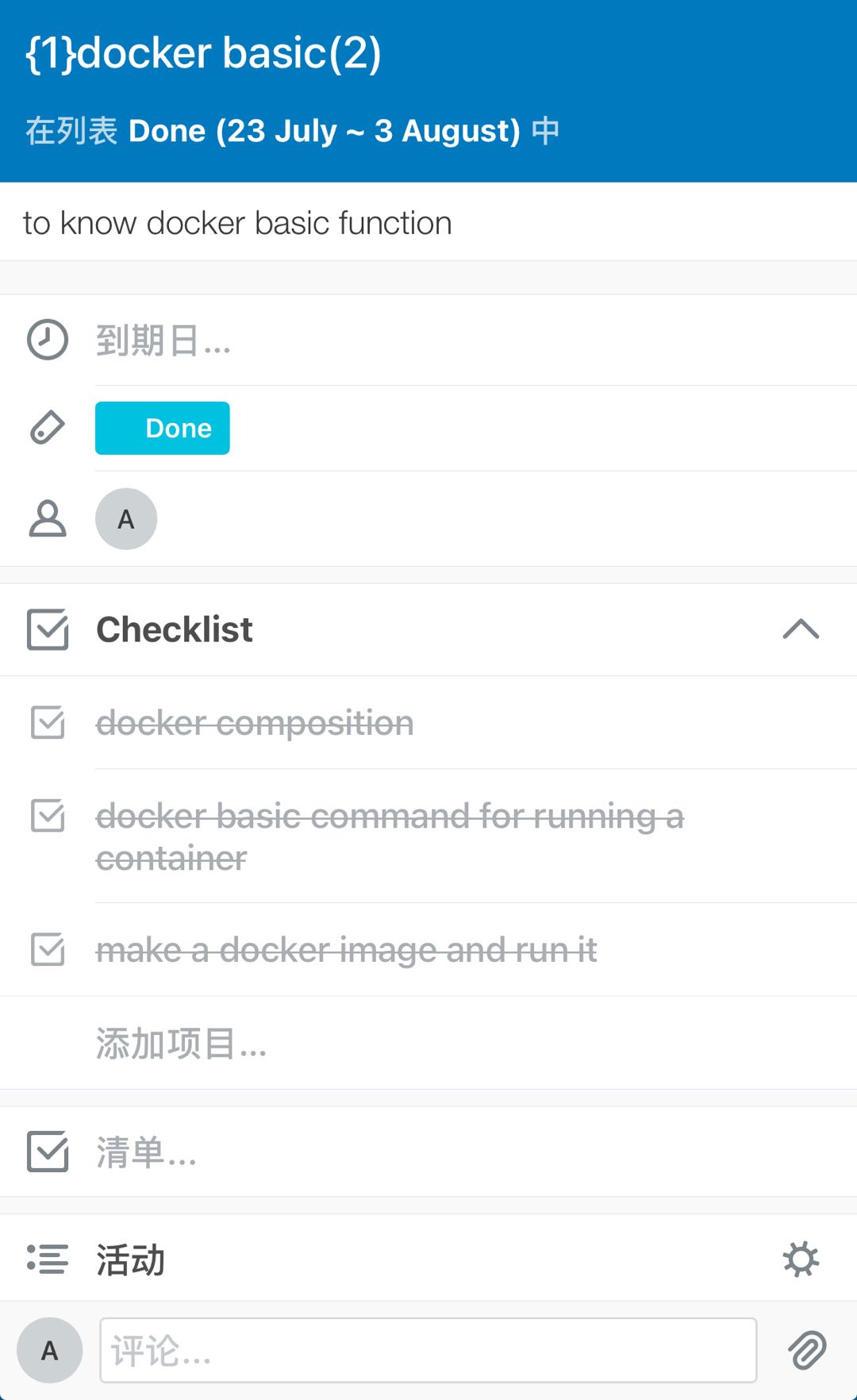 每个卡片为一个具体任务,可以设置开发时间,设置任务状态,check list是用来验收任务-闭环:
