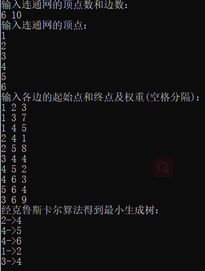 {int arcnum,vexnum;edge edges;CreateUDN(&edges,&vexnum,&arcnum);//对连通网中的所有边进行升序排序,结果仍保存在edges数组中qsort(edges, arcnum, sizeof(edges[0]), cmp);//创建一个空的结构体数组,用于存放最小生成树edge minTree;//设置一个用于记录最小生成树中边的数量的常量int num=0;//遍历所有的边for (int i=0; i<arcnum; i++) {//找到边的起始顶点和结束顶点在数组assists中的位置int initial=Locatevex(vexnum, edges[i].initial);int end=Locatevex(vexnum, edges[i].end);//如果顶点位置存在且顶点的标记不同,说明不在一个集合中,不会产生回路if (initial!=-1&& end!=-1&&assists[initial].sign!=assists[end].sign) {//记录该边,作为最小生成树的组成部分minTree[num]=edges[i];//计数+1num++;//将新加入生成树的顶点标记全不更改为一样的for (int k=0; k<vexnum; k++) {if (assists[k].sign==assists[end].sign) {assists[k].sign=assists[initial].sign;}}//如果选择的边的数量和顶点数相差1,证明最小生成树已经形成,退出循环if (num==vexnum-1) {break;}}}//输出语句printf("经克鲁斯卡尔算法得到最小生成树:\n");for (int i=0; i<vexnum-1; i++) {printf("%d->%d\n",minTree[i].initial,minTree[i].end);}return;