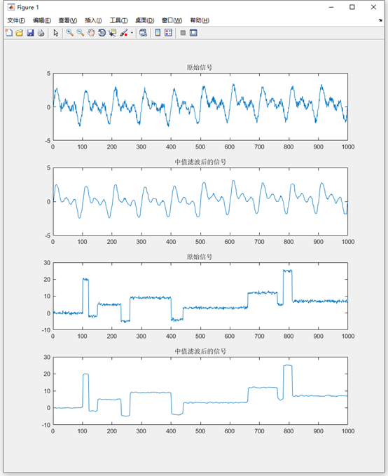 %**************************************************************************************** % % 信号Mix_Signal_1 和 Mix_Signal_2 分别作中值滤波 % %***************************************************************************************%混合信号 Mix_Signal_1 中值滤波 Signal_Filter=medfilt1(Mix_Signal_1,10);subplot(4,1,1); %Mix_Signal_1 原始信号 plot(Mix_Signal_1); axis([0,1000,-5,5]); title('原始信号 ');subplot(4,1,2); %Mix_Signal_1 中值滤波后信号 plot(Signal_Filter); axis([0,1000,-5,5]); title('中值滤波后的信号');%混合信号 Mix_Signal_2 中值滤波 Signal_Filter=medfilt1(Mix_Signal_2,10); subplot(4,1,3); %Mix_Signal_2 原始信号 plot(Mix_Signal_2); axis([0,1000,-10,30]); title('原始信号 ');subplot(4,1,4); %Mix_Signal_2 中值滤波后信号 plot(Signal_Filter); axis([0,1000,-10,30]); title('中值滤波后的信号');