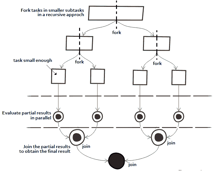 public class SumRecursiveTask extends RecursiveTask<Integer> {private static final Logger logger = Logger.getLogger(SumRecursiveTask.class.getName());private static final int THRESHOLD = 10;private final List<Integer> worklist;public SumRecursiveTask(List<Integer> worklist) {this.worklist = worklist;}@Overrideprotected Integer compute() {if (worklist.size() <= THRESHOLD) {return partialSum(worklist);}return ForkJoinTask.invokeAll(createSubtasks()).stream().mapToInt(ForkJoinTask::join).sum();}private List<SumRecursiveTask> createSubtasks() {List<SumRecursiveTask> subtasks = new ArrayList<>();int size = worklist.size();List<Integer> worklistLeft = worklist.subList(0, (size + 1) / 2);List<Integer> worklistRight = worklist.subList((size + 1) / 2, size);subtasks.add(new SumRecursiveTask(worklistLeft));subtasks.add(new SumRecursiveTask(worklistRight));return subtasks;}private Integer partialSum(List<Integer> worklist) {int sum = worklist.stream().mapToInt(e -> e).sum();logger.info(() -> "Partial sum: " + worklist + " = "+ sum + "\tThread: " + Thread.currentThread().getName());return sum;}