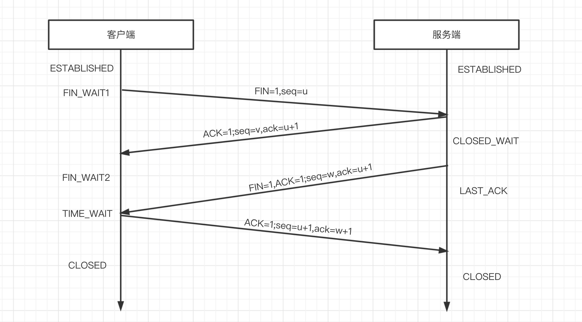 - 客户端接收到服务连接释放确认的报文,并响应给服务端ACK,同时将服务端携带的序号+1返回,同时也将携带服务端返回的序号响应ack一同返回给服务端,此时客户端TCP连接仍然未完全关闭,需要等待一段时间用于处理连接释放等收尾工作才会自动关闭,最后客户端与服务端都处于CLOSED状态.