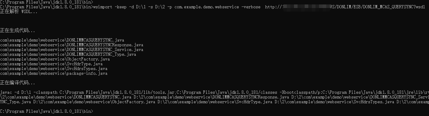 1.在jdk安装目录bin下wsimport.exe,执行命令(修改红色部分的信息即可) wsimport -keep -d D:\1 -s D:\2 -p com.example.demo.webservice -verbose http://xxxxxxx?wsdl