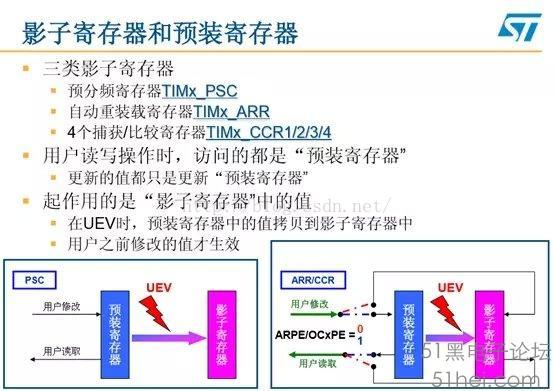 2、影子寄存器才是真正起作用的寄存器,但是ST没有提供这个寄存器出来,只是提供出与之相对应的预装载寄存器,分别为“PSC,ARR,CCRx”