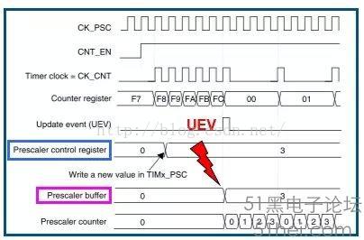 1、用户程序对TIMx_PSC寄存器值的修改或读取都是操作其预装载寄存器,其修改值只能通过更新事件后才能生效,即从TIMx_PSC的预装寄存器拷贝到TIMx_PSC的影子寄存器。