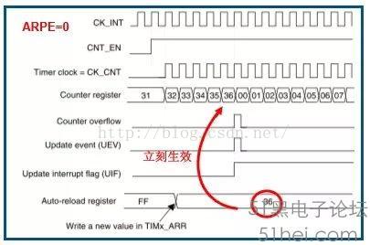 4、从预装载寄存器ARR传送到影子寄存器,有两种方式,一种是立刻更新,一种是等触发事件之后更新;这两种方式主要取决于寄存器TIMx->CR1中的“APRE”位;