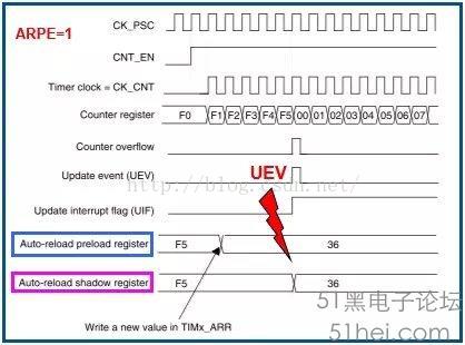 4.2 , APRE=1,当ARR值被修改时,必须在下一次事件UEV发生后才能更新影子寄存器的值;