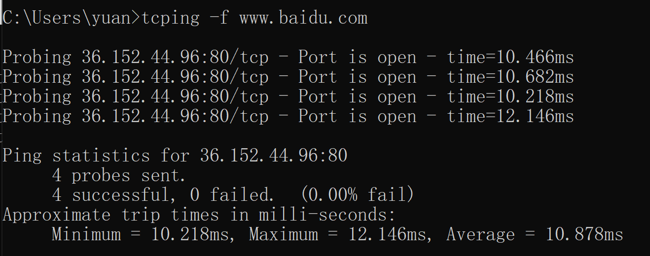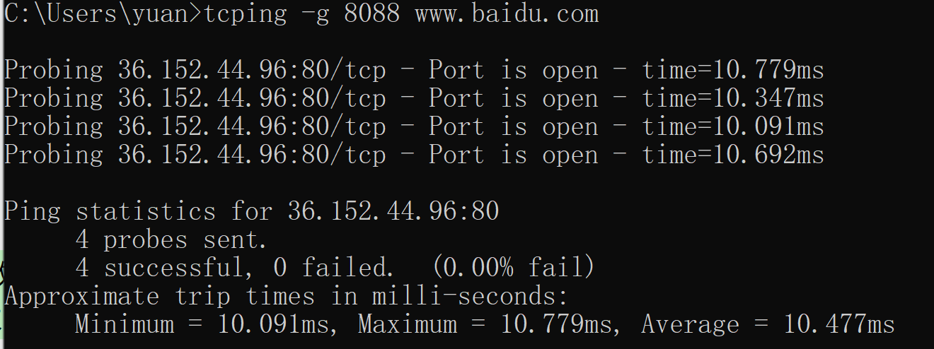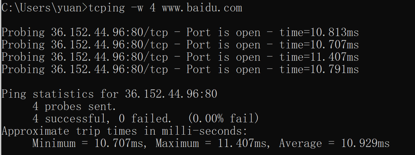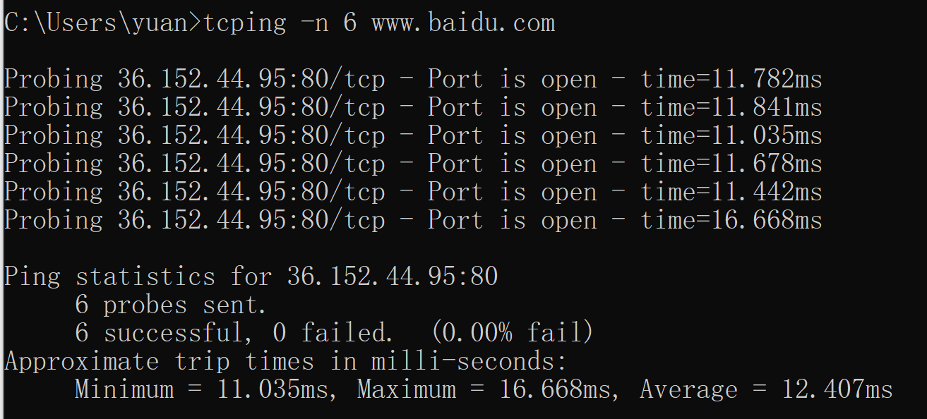 -n 数字,发送命令的次数,默认4次,tcping -n 6 www.baidu.com 会tcping 百度6次,也可以跟其他数字。