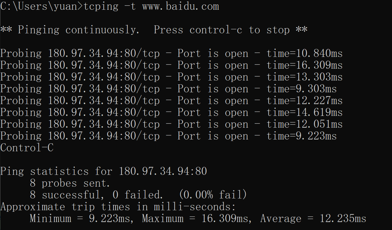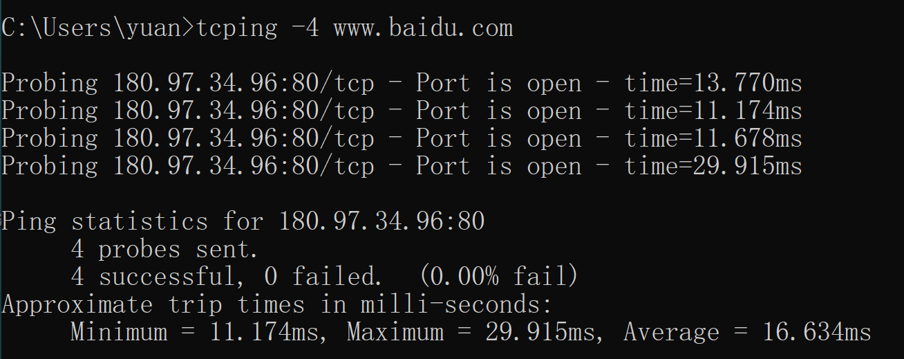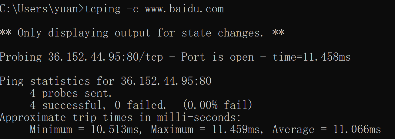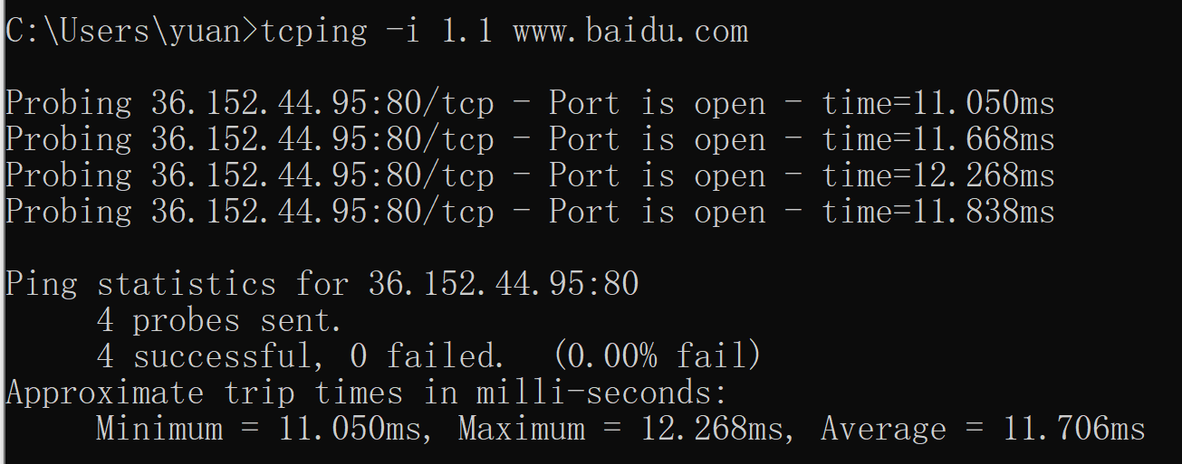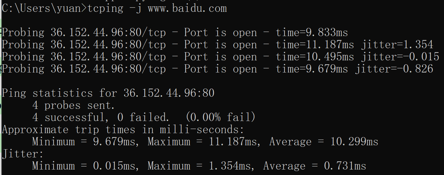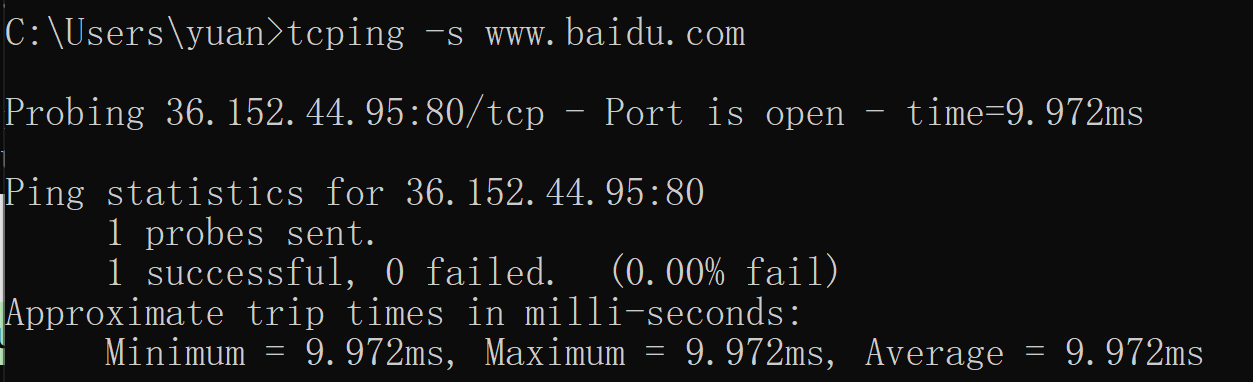--block tcping不通的等待时间,默认是20秒(很长)。–block可以把-w参数冲突掉 ,例如tcping --block www.baiu.com网址不正确,显然tcpping不通,默认会等待20s 。 tcping -w 0.5 –block www.baiu.com还是会等20s,而不是0.5s,因为–block选项会把-w选项冲突掉。