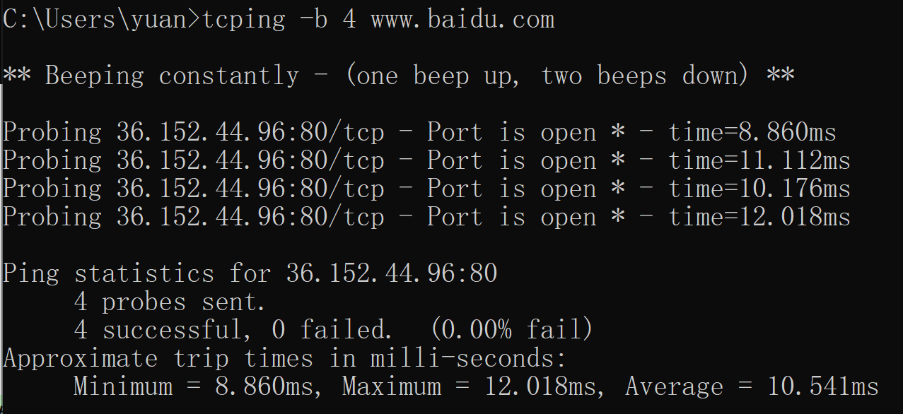 -b 数字,开启蜂鸣器,参数4会一直响铃,tcping -b 4 www.baidu.com