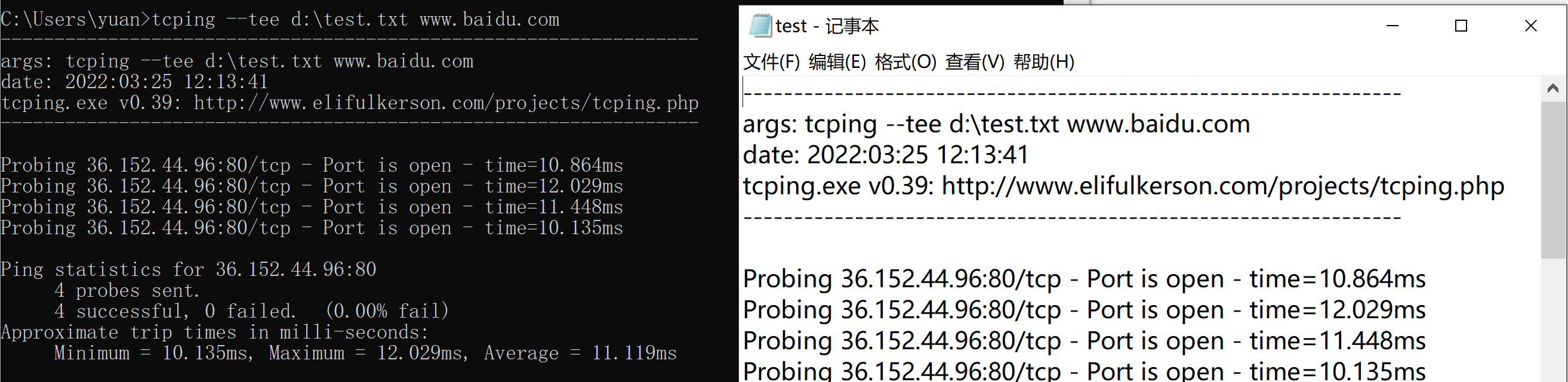 --tee file_path,将结果输出到指定位置,tcping –tee /data/test.txt192.168.0.100,会把ping的结果保存在/data下的test文件中