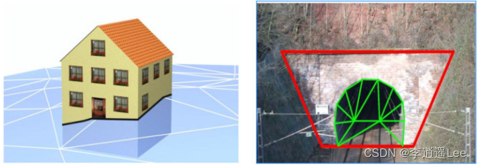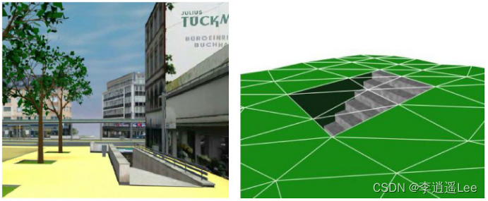 闭合面的概念也被用来对地下物体的入口进行建模。隧道或人行地下通道等物体必须被建模成封闭的实体,用于 计算其体积,例如在洪水模拟。地下物体的入口也必须封闭,以避免数字地形模型中的洞(见图4)。但是,在近 距离可视化中,入口必须开放。因此,闭合面是建模这些入口的合理方法。