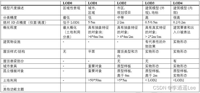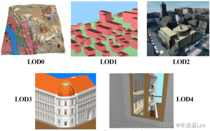 最粗略的LOD0级别基本上是一个2.5维的数字地形模型,上面覆盖着航空图像或地图。在LOD0中,建筑可以用 迹线或屋顶边缘多边形来表示。众所周知,LOD1是由带平屋顶结构的棱柱状建筑组成的块状模型。相比之下 ,LOD2中的建筑有不同的屋顶结构和不同主题的边界表面。LOD3表示有详细的墙和屋顶结构的建筑模型,可能 包含门和窗户。LOD4在LOD3的基础上又为建筑物添加了内部结构。例如,LOD4中的建筑由房间、室内门、楼 梯和家具组成。在所有的LOD外观信息,如高分辨率纹理可以映射到结构中(参见6.9)。