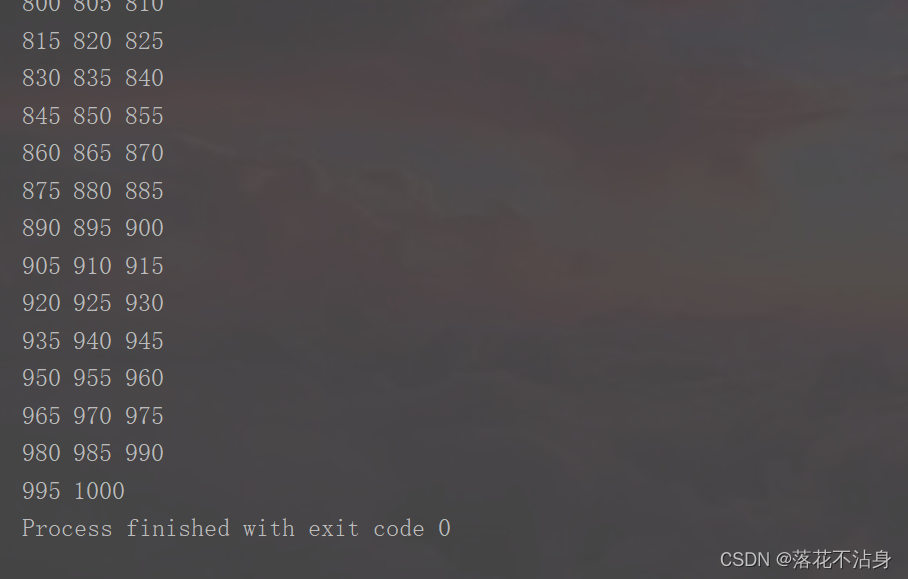 public class Demo08 {public static void main(String[] args) {//用while和for循环输出1-1000之间能被5整除的数,并且每行输出3个 for (int i = 1; i <= 1000; i++) {if (i%5==0){System.out.print(i+"\t");}if (i%(5*3)==0){ //换行System.out.println();}}//print 输出完不会换行//println 输出完会换行} }