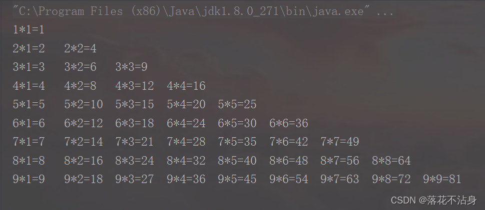 public class Demo01 {public static void main(String[] args) {//1.我们先打印第一列,这个大家应该都会//2.我们把固定的1再用一个循环包起来//3.去掉重复项,j <= i//4.调整样式for (int i = 1; i <= 9; i++) {for (int j = 1; j<=i; j++){System.out.print(i+"*"+j+"="+(i*j)+"\t");}System.out.println();}} }
