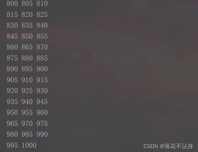 public class Demo09 {public static void main(String[] args) {int i = 1; while (i<=1000){i++;if (i%5==0){System.out.print(i+"\t");}if (i%(5*3)==0){System.out.println();}}} }