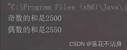 public class Demo07 {public static void main(String[] args) {//计算0到100之间奇数和偶数的和int addSum = 0; //奇数int evenSum = 0; //偶数 for (int i = 0; i <= 100; i++) {if (i%2!=0){addSum +=i;}else {evenSum +=i;}}System.out.println("奇数的和是"+addSum);System.out.println("偶数的和是"+evenSum);} }