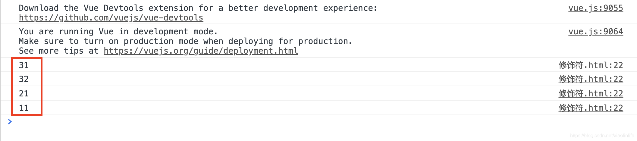 这里发现先触发了区域1和2中的事件,然后再到区域3中的事件。 说明加上.capture修饰符是在捕获阶段触发了事件。 因为设置了stop所以冒泡阶段的事件没有触发,没有打印出22,12,如果不加stop,会打印出22,12的