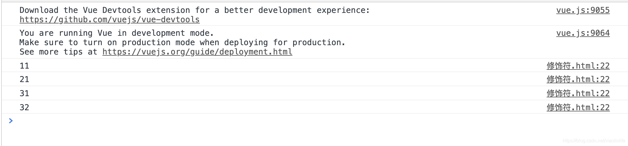 <body><div id='app'><div @click.capture="log('11')" @click="log('12')" @click.self="log('13')" style="background-color: aqua; height: 400px; width: 400px;"><div @click.capture="log('21')" @click="log('22')" @click.self="log('23')" style="background-color: #2195de; height: 200px; width: 400px;"><div @click.stop="log('31')" @click.self="log('32')" style="background-color: #9521de; height: 100px; width: 400px;color:#fff;line-height: 100px;text-align: center;">事件修饰符探索</div></div></div></div><script>var app = new Vue({el:"#app",methods:{log(value){console.log(value)}}})</script>