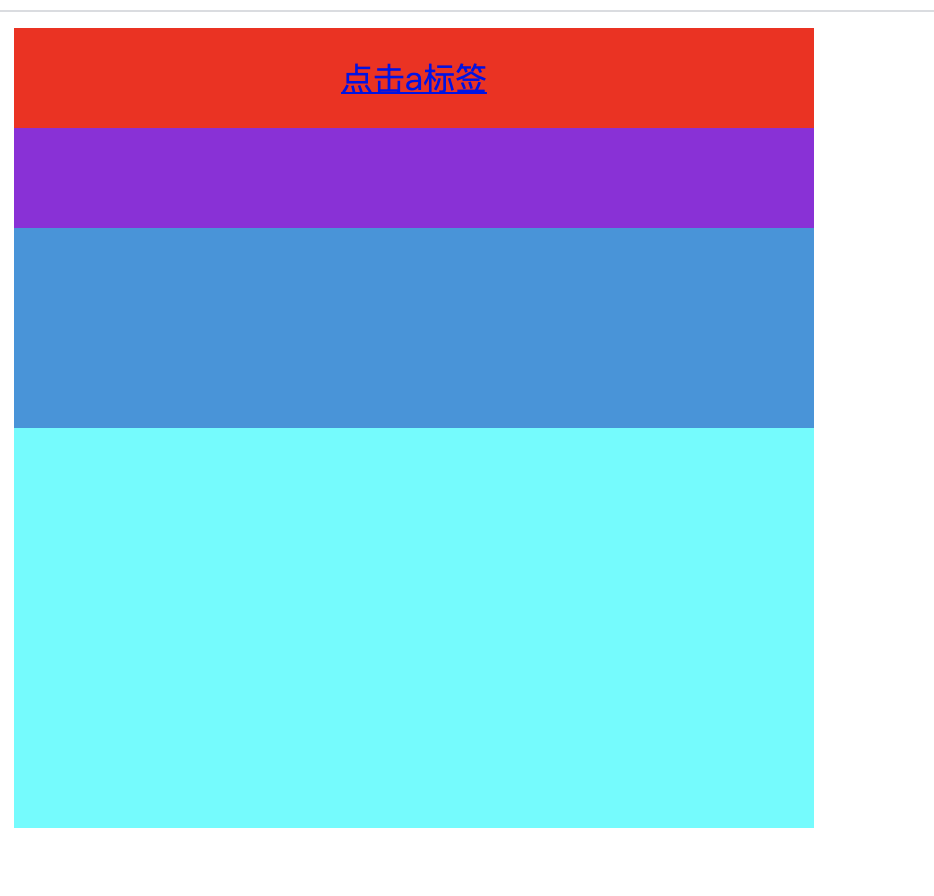 <div id='app'><div @click.capture="log('11')" @click="log('12')" @click.self="log('13')" style="background-color: aqua; height: 400px; width: 400px;"><div @click.capture="log('21')" @click="log('22')" @click.self="log('23')" style="background-color: #2195de; height: 200px; width: 400px;"><div @click.capture="log('31')" @click="log('32')" @click.self="log('33')" style="background-color: #9521de; height: 100px; width: 400px;color:#fff;line-height: 50px;text-align: center;"><a @click="log('41')" @click.capture="log('42')" href="javascript: console.log('默认事件')" style="display: block;height: 50px;width: 4oopx;background-color: red;">点击a标签</a></div></div></div></div>