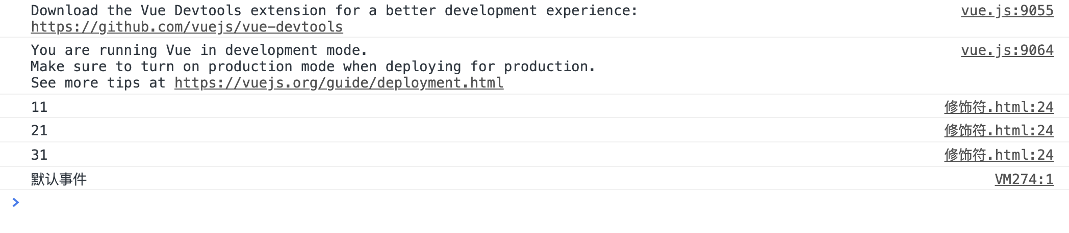 <div id='app'><div @click.capture="log('11')" @click="log('12')" @click.self="log('13')" style="background-color: aqua; height: 400px; width: 400px;"><div @click.capture="log('21')" @click="log('22')" @click.self="log('23')" style="background-color: #2195de; height: 200px; width: 400px;"><div @click.capture="log('31')" @click="log('32')" @click.self="log('33')" style="background-color: #9521de; height: 100px; width: 400px;color:#fff;line-height: 50px;text-align: center;"><a @click.passive="log('41')" @click.capture="log('42')" href="javascript: console.log('默认事件')" style="display: block;height: 50px;width: 4oopx;background-color: red;">点击a标签</a></div></div></div></div>
