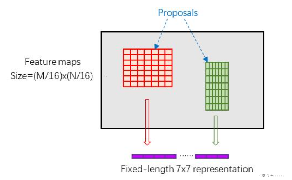 (4)这样处理后,即使大小不同的proposal输出结果都是pooled_w x pooled_h固定大小,实现了固定长度输出,如下图