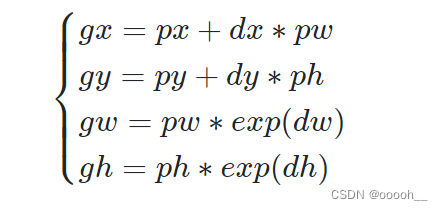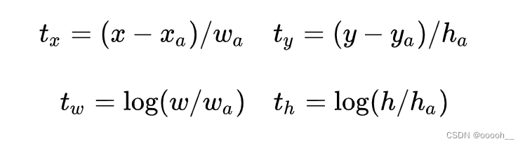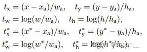 其中[xa,ya,wa,ha]是anchor的中心点坐标和宽高,[tx.ty,tw,th]是这个回归层预测的偏移量,通过这个公式计算出修正后的anchor坐标[x,y,w,h]。计算如下: