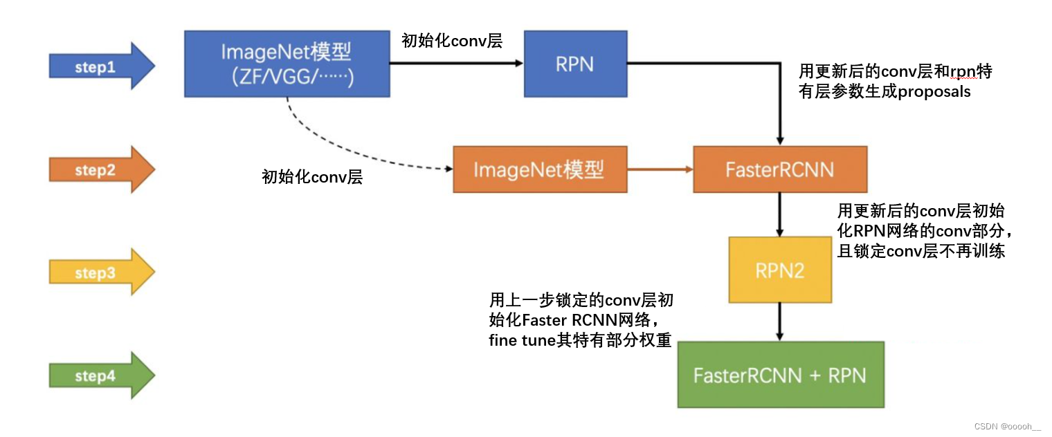 第三步:再次使用ImageNet的预训练权重初始化Faster RCNN网络的共享conv层(Faster RCNN特有层随机初始化),然后训练Faster RCNN网络。训练完后,共享conv层和Faster RCNN特有层的权重都更新了。
