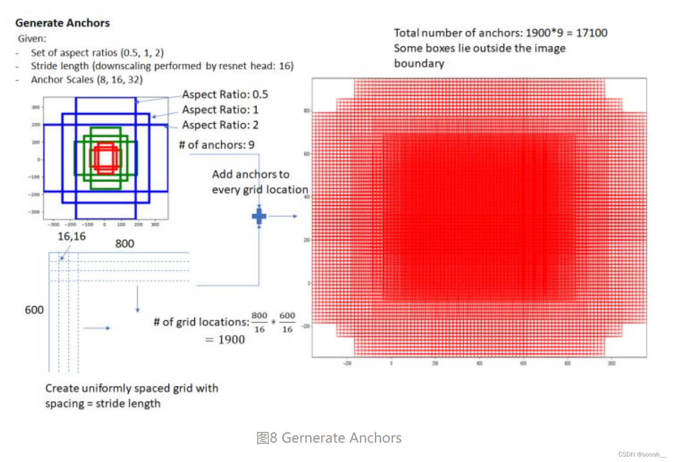 设置anchor是为了覆盖图像上各个位置各种大小的目标,那么原图上anchor的数量就是(M/16) x (N/16) x 9。这么多anchor,第一肯定不准确,第二肯定不能要这么多,所以后续还会淘汰一大批以及修正anchor位置。图8可视化后更清晰,这些anchor都会用于后续的分类和回归。