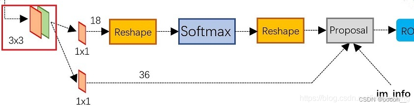 Reshape层是技术细节问题,对feature map进行维度变换,使得有一个单独的维度为2,方便在该维度上进行softmax操作,之后再Reshape恢复原状。